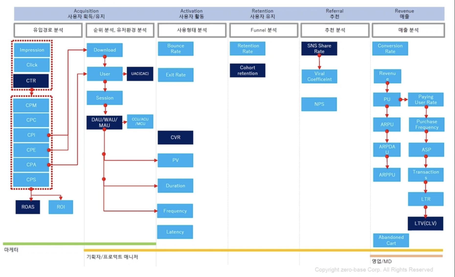 1. 에퀴지션: CTR 노출대비 클릭률 CAC 고객 획득 비용 ROAS 광고비 대비 매출액